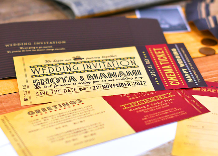 「えーオリジナルなのに?」と思われるかもしれませんが、一番おすすめでスマートな方法。商品ラインナップの中から基本の形になるアイテムを選びます。たとえば「映画好きの二人だから好きな作品の入場券風にしたい!」となればベースにおすすめなのはチケット風招待状シネマ(入力印刷込)、「好きな野球チームの観戦チケット風にしたい!」となれば野球観戦チケット風招待状(入力印刷込)などなど。