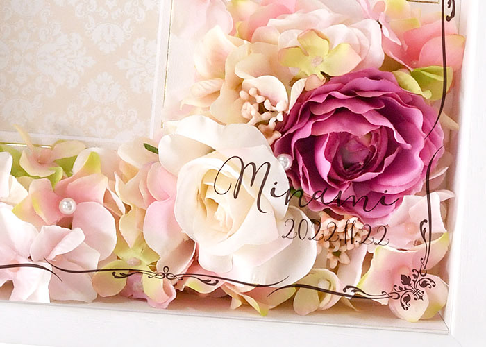 それからこれぞ記録用!という感じですが、うんと引いてサイズ感を掴むショットも。サイズ比較に雑貨を並べてもいいかも。そして思い出ポイント高いのが、自分なりにこだわった点。色でもお花でもフォントでも、「ここ好き!これが気に入って決めたんだよねー」というところをクローズアップしてパシャリ。日付や名前の入ってるところもいいですよね。