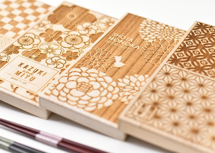 こちらの感謝箸はレーザーでデザインの刻まれたおしゃれな桐箱入りの夫婦箸。中身はもちろん、外装も式後ながーく使っていただきたい贈り物です。