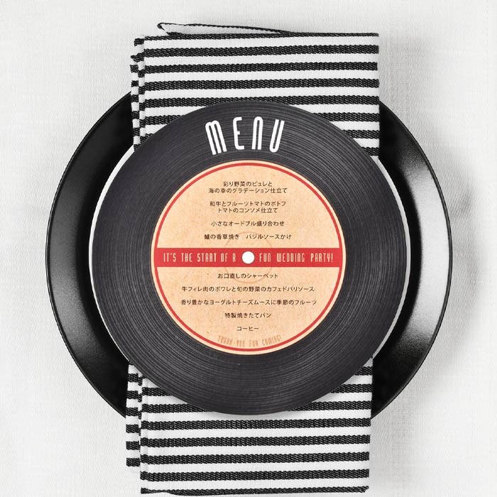 レコードみたいなデザインのものも!他にもたくさんのユニークなデザインのメニュー表がありますのでお二人の結婚式にぴったりのものが見つかるはず。