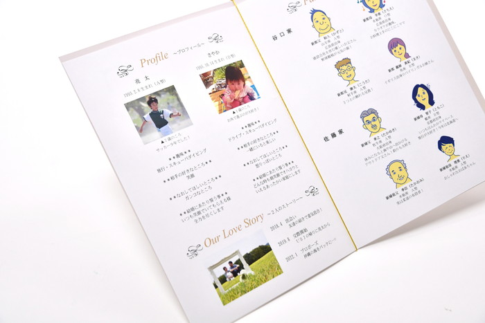 そんな身内に配るしおりなので、神経質に頑張りすぎなくてOK♪形もA4サイズでレイアウトして、二つに折るタイプが簡単でおススメ。席次表手作りキットをうまく活用するのもいいかもしれません。