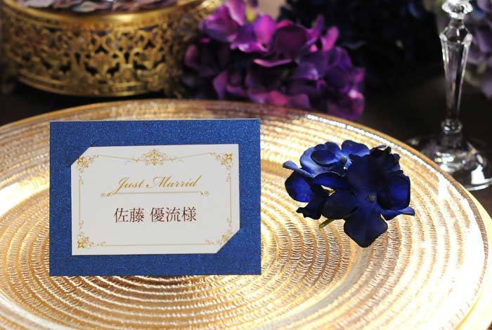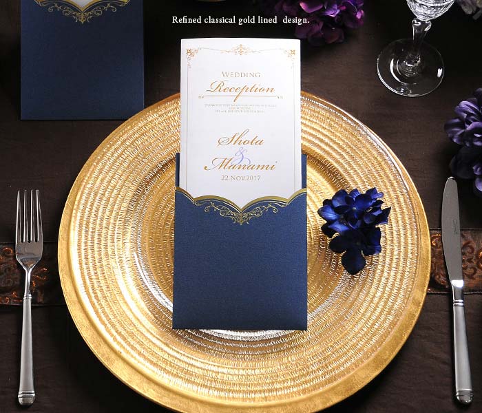 ネイビーの紙に金色の箔押しで飾られた『ディーナ席次表』は、上品でシックな席次表です。プロならではの高級感あふれる仕上がりになっています。