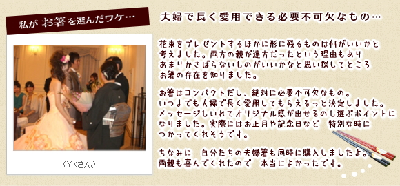 また、2本並んだお箸は長い人生をともにしていく夫婦の姿そのもの。「お父さんお母さんのような仲睦まじい夫婦を目指します」「2人で支え合って生きていくからあたたかく見守ってて…」そんな思いをお箸に込めてみてはいかがでしょうか。