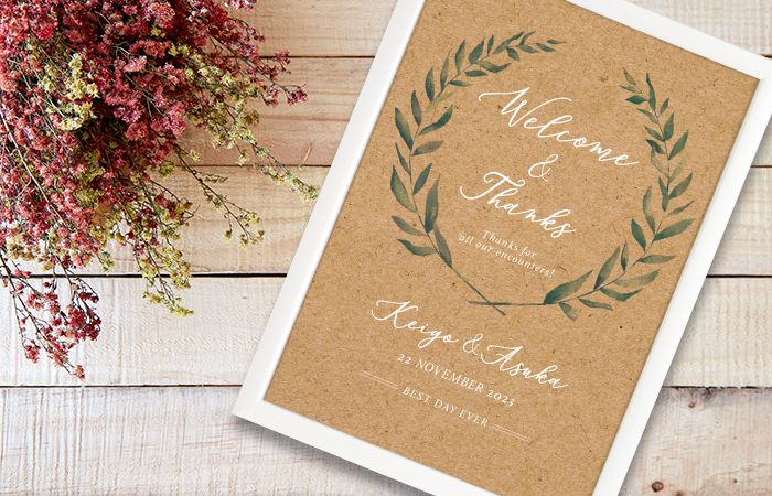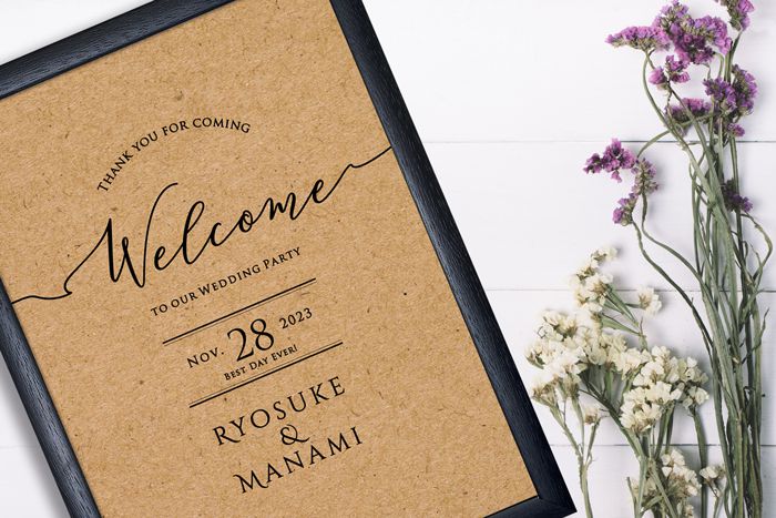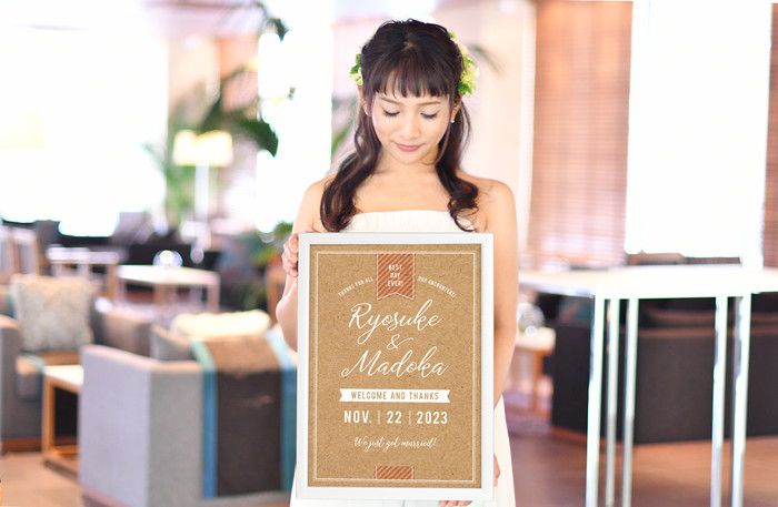 文字が白色だからクラフト風のベースとの組み合わせも優しい雰囲気に仕上がっています。ナチュラルガーデン系ウェディングに最適♡
