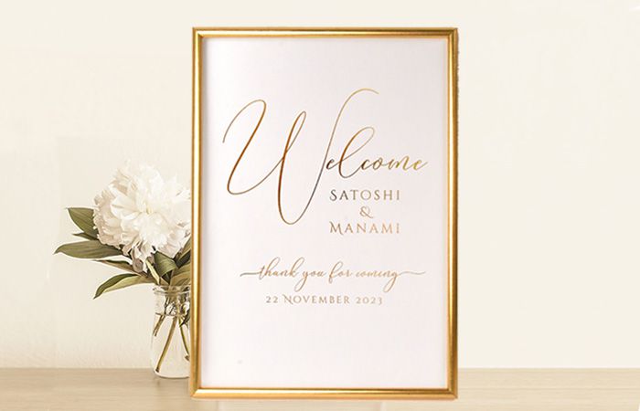 背景画像やグラフィックデザインがなくてもオシャレなウェルカムボードがあります。シンプルな文字だけだけど、ゴールフレーム&金箔文字だから上品さUP。