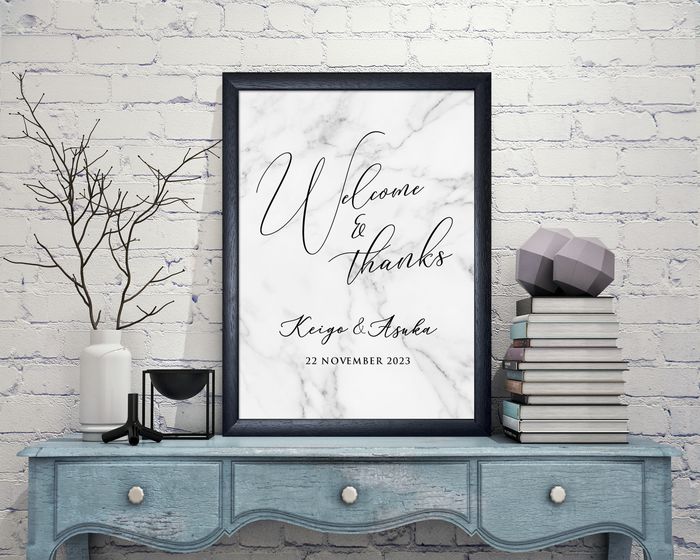 挙式後のインテリアにも最適。シンプルで邪魔しない人気の大理石デザインをベースにしたウェルカムボード。