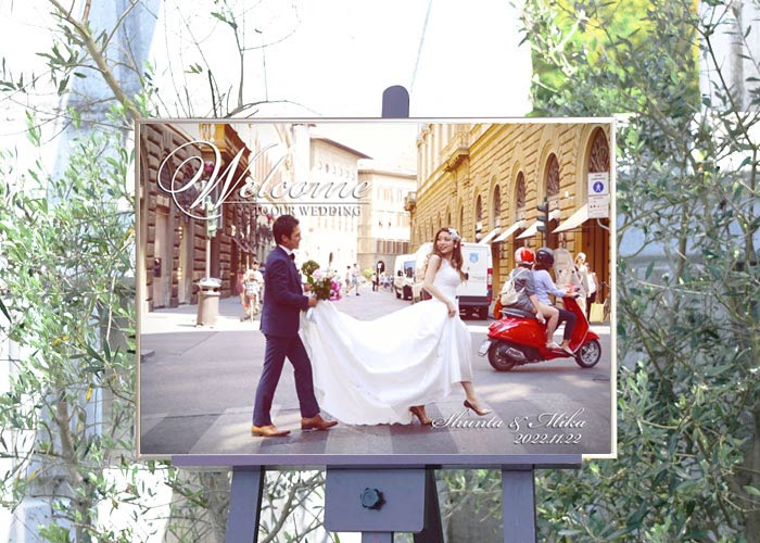 隣接会場さんを通せんぼしてしまわないスマートでかつ背の高いイーゼル×大胆な大判プリント写真を使用したウェルカムボードは個性的でおすすめ。