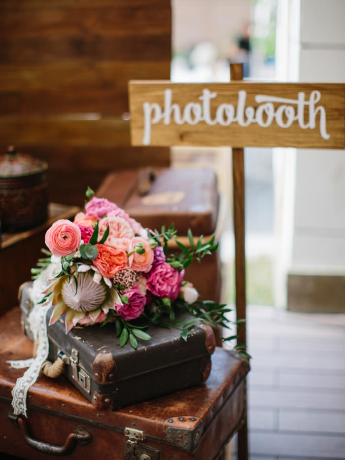 受付記帳用のテーブルをのぞいたら、アイテムをたくさん並べる床も、立てかける壁も、装飾を吊るす天井も使えない。空間だけが提供されて、すがるベースになるものが見当たらない時は、箱馬やトランクケースなどボックス状のもので島を作ってしまうのがおすすめです。ぐるりレイアウトできるので小さめ低めの島でも個性的な演出に。
