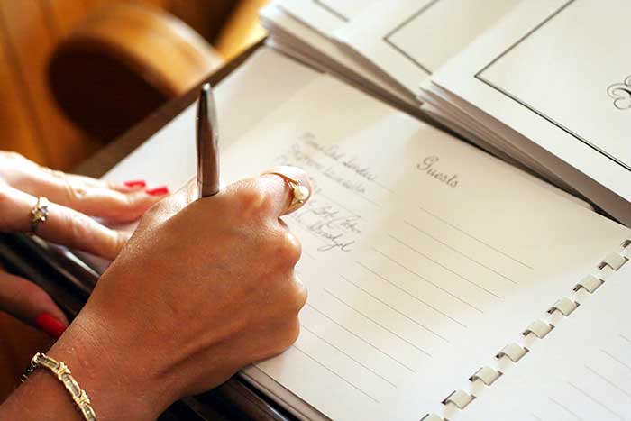 また、ゲストが当日持参し忘れる可能性も考慮しておきましょう。会場の受付に予備のゲストカードと筆記用具、記入スペースを設けておくと安心です。