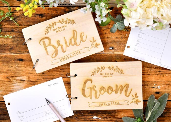 ゲストカードには、名前を新郎新婦へのメッセージを記入するのが一般的。住所や電話番号も合わせて記入する仕様になっている場合もありますが、形式は自由です。新郎新婦へのメッセージをゲストに記入してもらえば記念品として残せるので、メッセージ欄のあるゲストカードが人気!