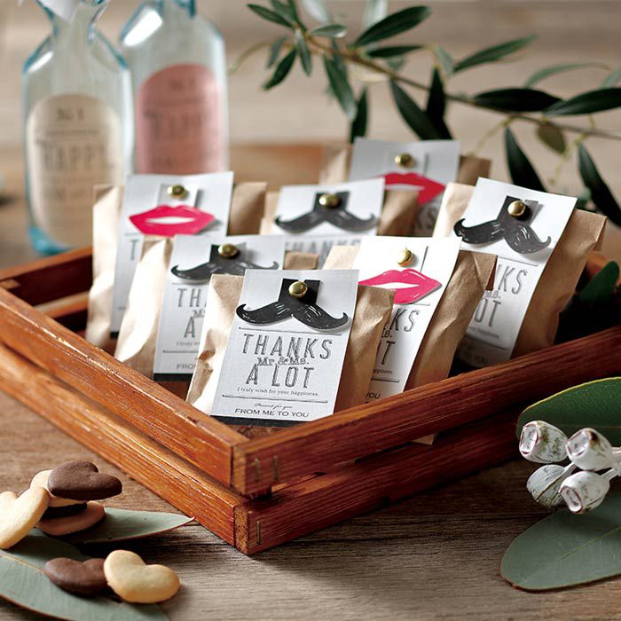 このとき、アイテムの価格のほかに頭に入れておきたいのが、ラッピンググッズの費用。せっかく自分たちでコーディネートするのだから、中身だけでなくラッピングにもこだわりたいですよね。袋やリボン、シールをそれぞれ用意してもよいですが、中には一通りのラッピング用品がセットになったものもあります。プチギフトの価格+ラッピング代が予算内に収まるように、それぞれの組み合わせを考えてみましょう。
