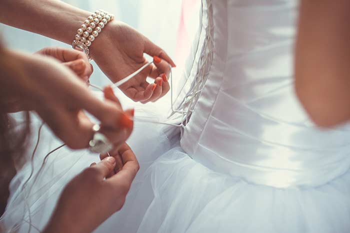コルセット状のインナーは、ウエストをきゅっと締め、バストラインを整え、シルエットをキレイに魅せてくれます。ドレスの中で足さばきをよくするペチコートも欠かせません。