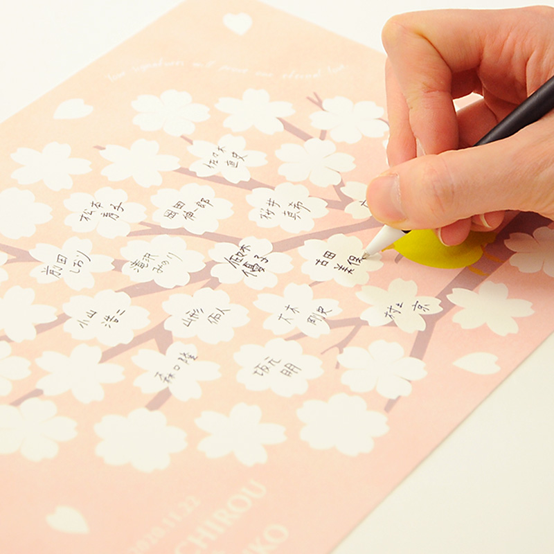 ゲストさん一人一枚ずつシートを配ったり渡したりしてしっかり記入してもらいやすいものや、一枚のシートやボードに寄せ書きしてもらうなど。デザインやカラーバリエーションが選べるのはもちろん、お二人の名前入りデザインや