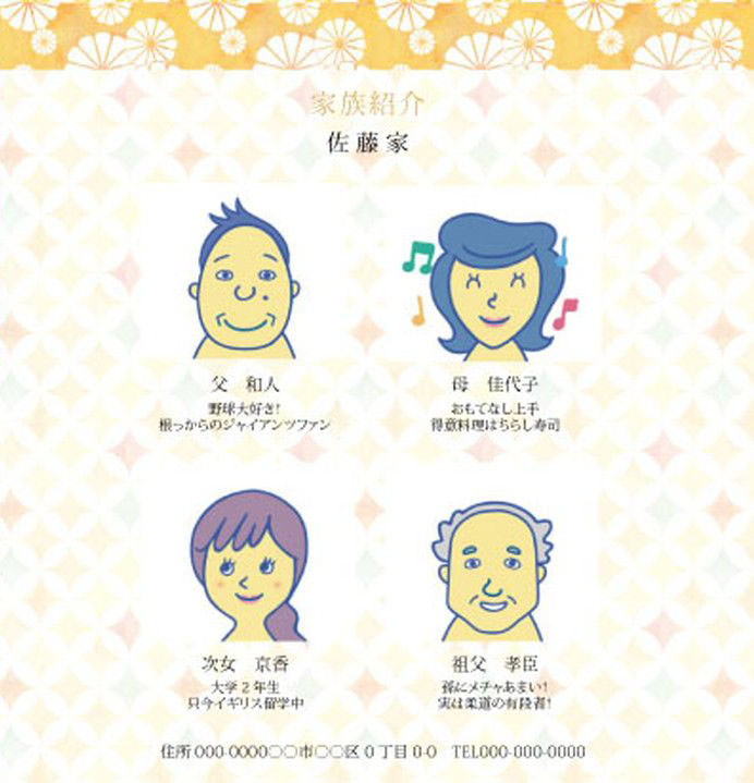 両端がそれぞれの家族紹介プロフィール表真ん中は二人のプロフィールになっています。ラインIDや実家住所なども入ります。