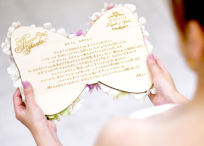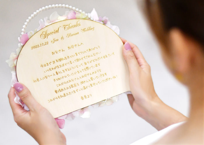 朗読には時間をそこまでかけない、手紙は他に渡すので朗読用にはさらっと渡したい、そんな時は式後飾れる&当日も可愛いミニブーケのようなアイテムがおすすめ。こちらの花嫁の手紙木製レーザー刻印「バッグブーケ」はダミー原稿が175文字。読む時間も1分を切るようになります。大切な感謝の言葉をさらりとしたため、記念品としてプレゼントします。