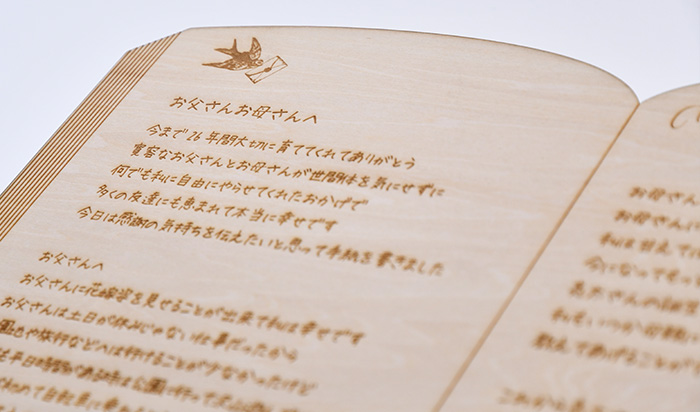 木製レーザータイプの花嫁の手紙・木製レーザー刻印「フォレストブック」は便箋2枚程度を想定されている方におすすめの仕上がりボリューム。本の形を模したデザインは、右左二段に分けて使えるから、たくさん書いてもスッキリ読みやすいレイアウト。