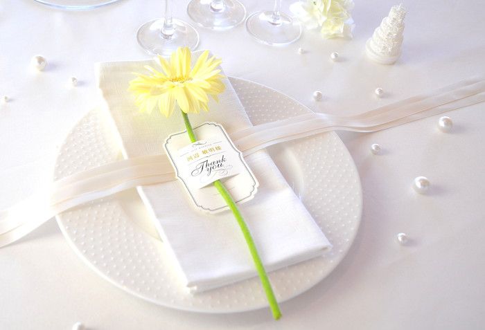 席札を自作する場合、カタチも大きさも自分好みにできるところも手作りの醍醐味。ただ、グラスに置くの?フォークにさす?向きはどっち?大きすぎてどこに置こう?などなど見たことない珍しい席札の場合、現場スタッフさんも戸惑うはず。