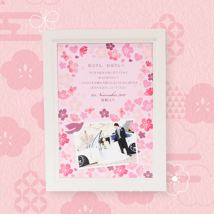 手紙と違って、いつも飾ってご家族にご覧いただけるアイテム。インテリアにするなら、プロに撮影してもらった前撮りのお写真がオススメ。あわせて幼少期のお写真も入れると、より思い出深いものになりますね。また、節目の時くらいこれまでの感謝や決意を自分の言葉で伝えたいもの。これからずっと残るものだからこそ、今の気持ちを言葉で飾って贈りましょう。贈ったあと、お写真(L判)の入れ替えを何度でも楽しめます。お急ぎの方は、写真なしで制作&ご自身で写真をセットしていただくという、納期スピードUPの裏技も。