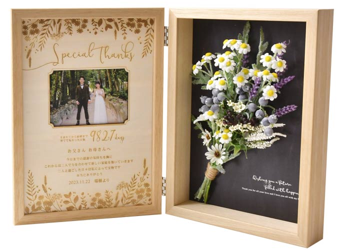こちらも人気のスワッグ風ブーケを取り入れた、フォトフレーム付きの子育て感謝状です。木にレザー彫刻をほどこしており、特別感たっぷりのボックスフレームになっています。ナチュラルで温かみのあるギフトで、育ててくれたご両親へ感謝の気持ちを伝えましょう。