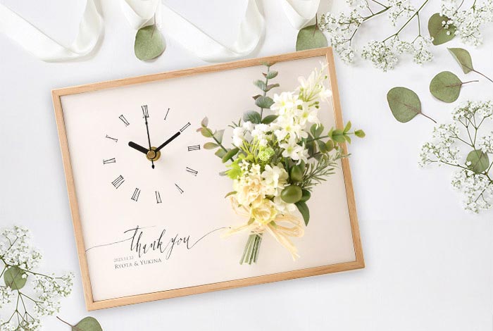 シンプルでありながらもナチュラルでオシャレな雰囲気漂う「クロックブーケ」は、インテリアにも最適です。4種類の中から選べるので、花嫁さんのウェディングブーケと雰囲気をそろえるのも素敵ですよ。