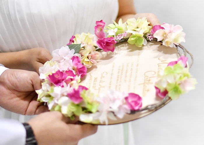 結婚証明書は、チャペル婚や人前式のセレモニーで新郎新婦が結婚の宣誓をする際に使用する誓約書。集まってくれたゲストを証人に、新しく夫婦となるふたりがサインをしたり、夫婦になるにあたっての誓いを立て宣誓文を読み上げたりします。