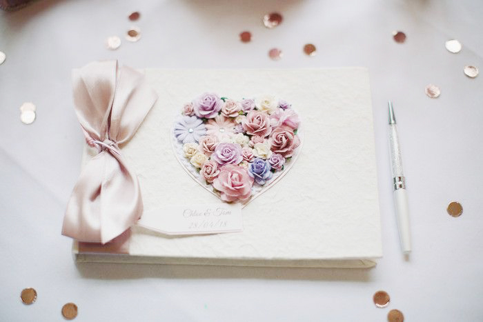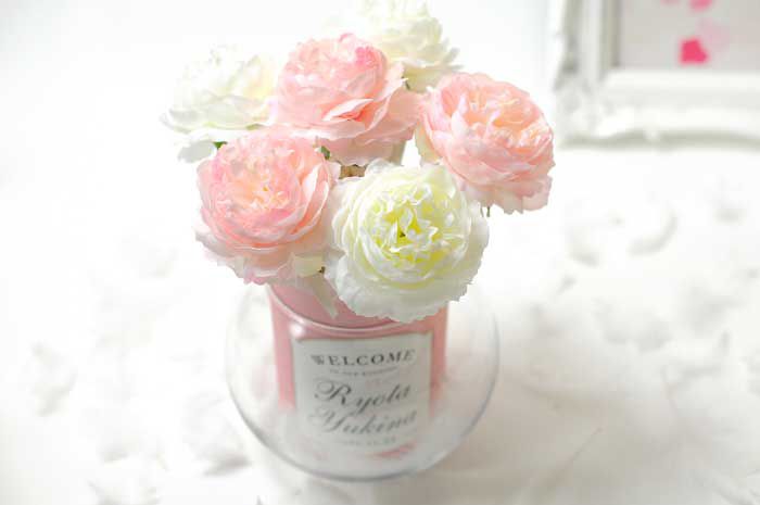 「クラシカルな感じの式場だったので、その雰囲気に合わせて、バラの花がうしろに付いたペンを用意。お式のあともリビングに飾ってます」(30代女性)