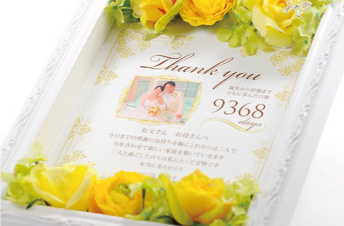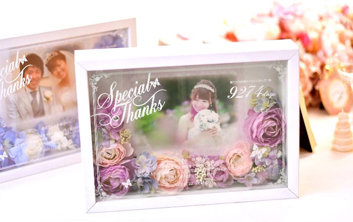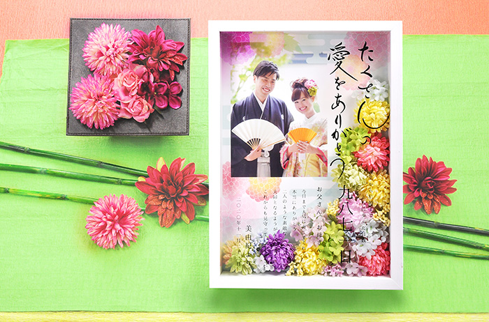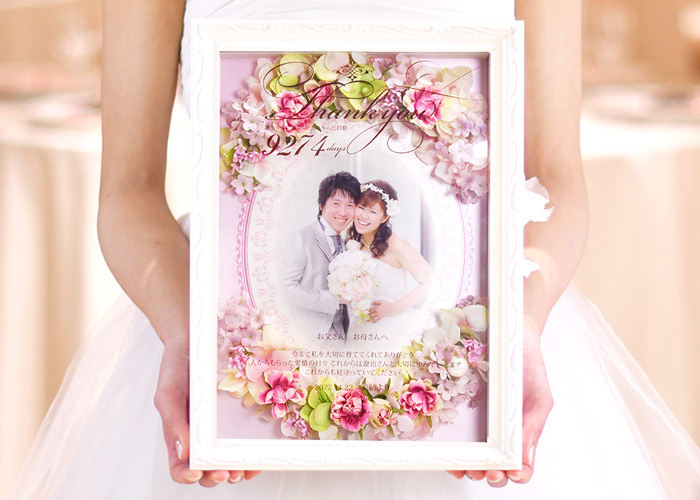 結婚式記念品贈呈シーンで選ばれる、感謝ボードや子育て感謝状・フォトフレームフラワーアイテム。そんな特別な贈り物のお写真を、美しく飾るアーティフィシャルフラワーの色とりどりのアレンジ。なんとなく周りに配置しているようで、実はとっても奥深い!