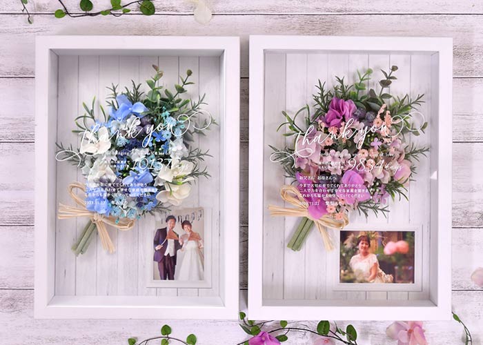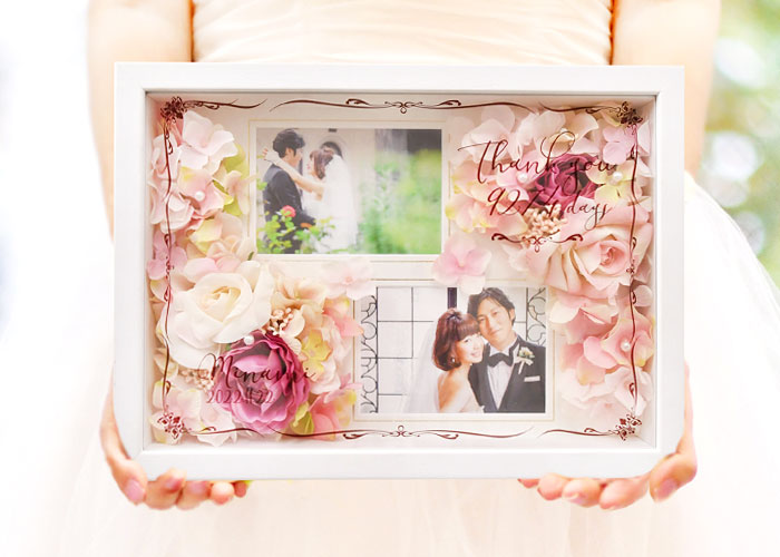 フレームとパネルを組み合わせて厚みを持たせたボードタイプの子育て感謝状。立体的な作りで華やかさばっちりです。こちらはブーケを閉じ込めたデザインになっていますが、フラワーを全面に敷き詰めたり、レースのようにカットしたペーパーで飾ったり、いろんなデザインがあります。