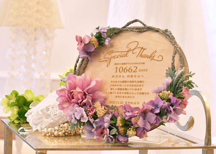 メッセージが描かれたパネルを取り囲むようにフラワーを飾ったリースタイプの子育て感謝状。インテリアとして飾りやすいデザインが魅力です。結婚式の季節や両親の好みに合わせたフラワーで飾ると特別感アップ!