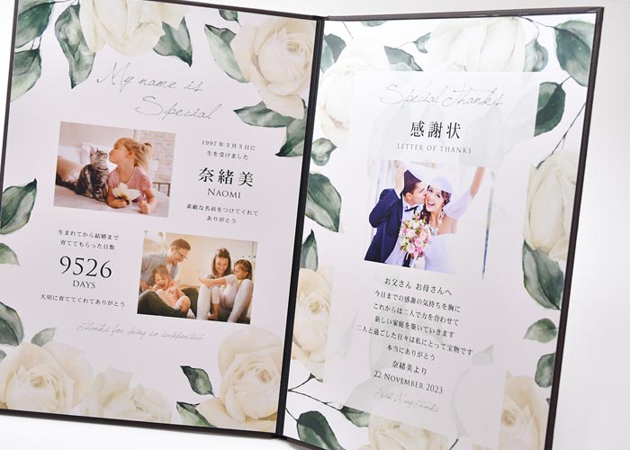 子育て感謝状には、生まれてから結婚式までの日数や写真、両親へのメッセージなどがつづられています。写真については、子どもの頃と現在の写真を並べて、記憶をたどるように工夫されたものが人気。メッセージ部分も、両親との思い出がよみがえるエピソードを交えたようなオリジナリティあふれるものが注目を集めています。
