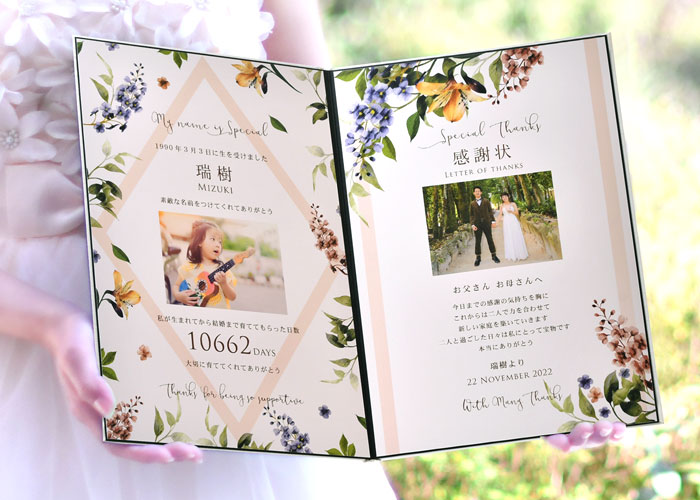 ブックタイプには写真が3枚入るタイプも。「感謝のメッセージだけでなく思い出の写真もたくさん使いたい」そんな人におすすめのデザインです。子どもの頃の写真、両親との家族写真、前撮りした結婚式の写真と、それぞれ違うシーンの写真をレイアウトするのがおすすめ♡