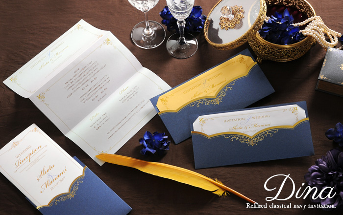 A4サイズを三つ折りにした本状上部にお二人のお名前と挙式日をレイアウト。パール感のあるネイビーの招待状台紙からのぞかせるおしゃれなデザイン。