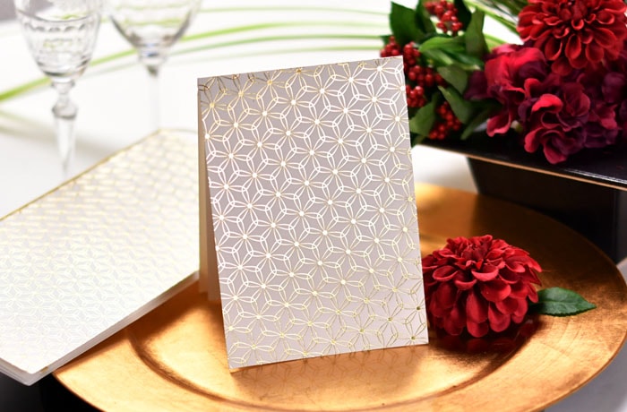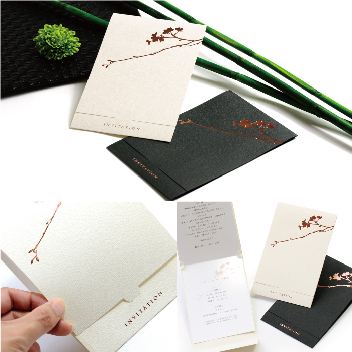 上品なピンクゴールドの箔押しと優しい手触りの台紙。和風にも洋風にもマッチする和モダンでお二人のきちんと感が伝わるデザイン。