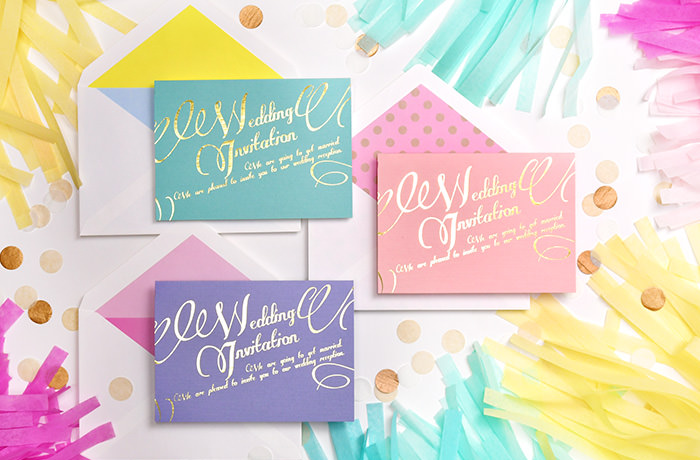 ラブリーなパステルカラーに箔押し。ほかにない旬なカラーを取り入れつつ大切な日にふさわしい 上質なデザインに。