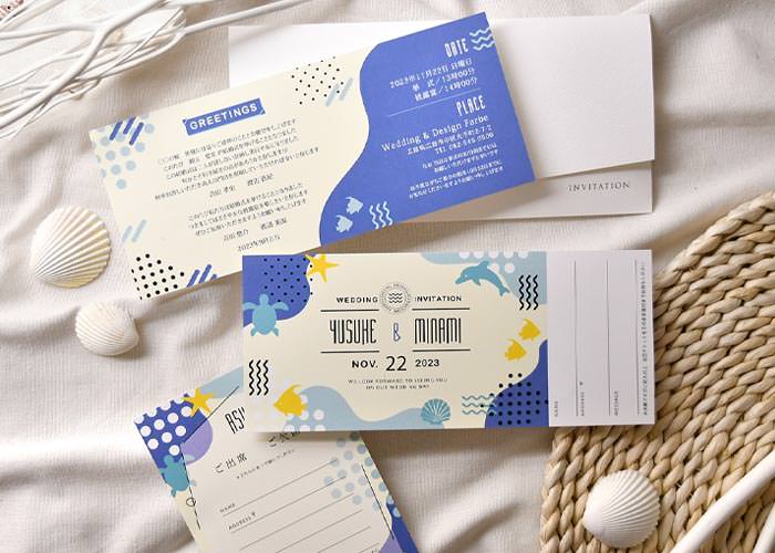 水族館のチケットみたいなチケットタイプ。水族館はもちろん、スキューバダイビングや海が大好き!というお二人にもぴったり。ミシン目入りの半券部分はゲストカードになっている完成品オーダーの招待状。