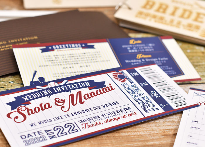 二人らしさを演出するサッカーの観戦チケットみたいな招待状。組み立てまで全部おまかせがうれしい完成品オーダータイプ。