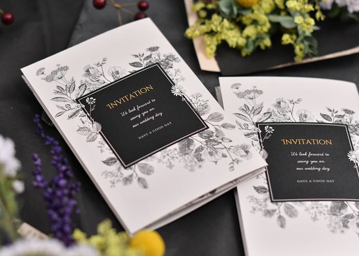 ボタニカル柄をシックに仕上げた洗練のデザイン。パソコンやプリンターを持っていない方にも安心の完成品オーダー招待状。