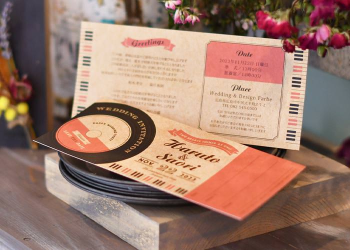 音楽好きのお二人にぴったりな音楽をテーマにデザインされたチケットタイプ。ミシン目入りの半券部分はゲストカードになっている完成品オーダーの招待状。