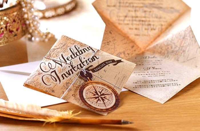 大昔に海路を切り開いてきた冒険者のように、始まる二人のあらたな旅をイメージして。アンティーク風のデザインがおしゃれな、ゲストをわくわくさせるサプライズ招待状です!アンティークなデザイン。