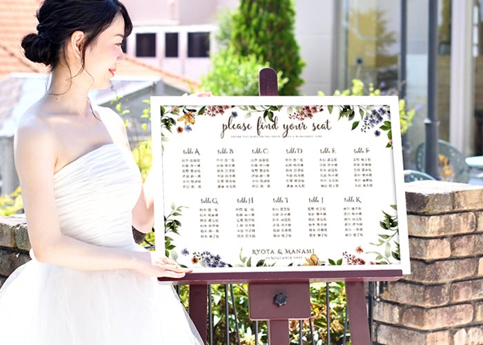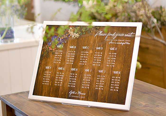 オリジナリティあふれる式にしたい方には、「脱!席次表」もおすすめです。日本では披露宴で、ゲスト一人ひとりに席次表を配り、各自に座席を確認してもらうスタイルが一般的ですよね。海外挙式では披露宴会場の入り口に置かれたシーティングチャートを見て、自分の席を確認します。