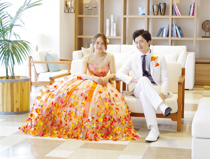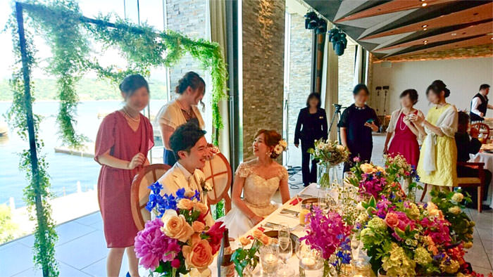 幸せいっぱいな瞬間なのが、高砂での写真撮影の様子からも伺えます。鮮やかなお花と笑顔いっぱいに囲まれてとっても素敵♡