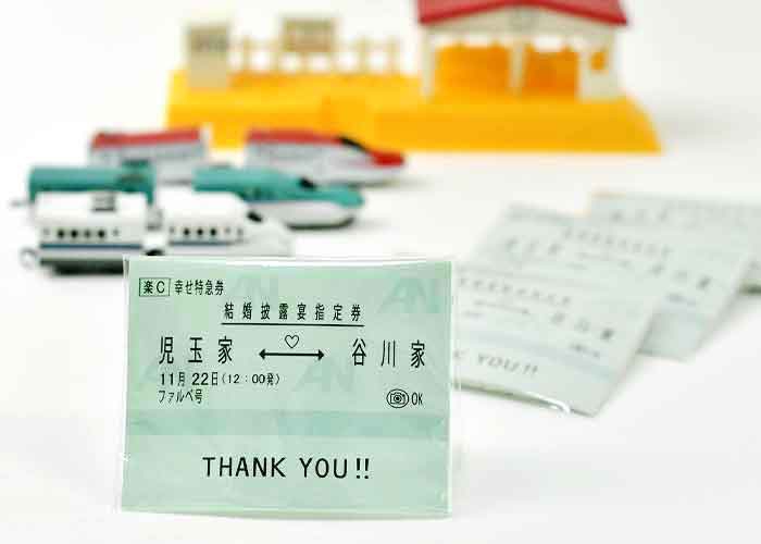 お見送りの際に渡すギフトを電車関連のものにするアイデアも◎例えばこんな新幹線チケット風のプチギフト。お見送りのシーンも二人らしく演出できる、遊びゴコロたっぷりのおもてなしアイテムです。
