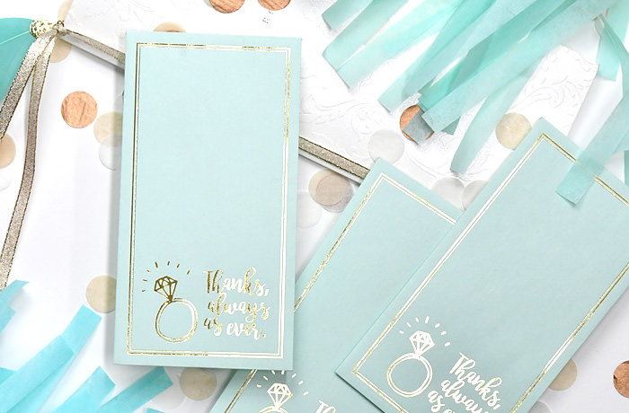 ゴールドの箔押しがキラキラとおしゃれに輝きます。お札を折らずに入れられるちょうどよいサイズ。テンプレートが付いているから手書きが苦手でもおしゃれに仕上げることができます。