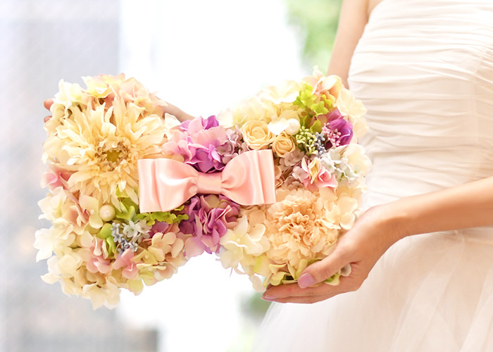 リボン型のフォルムに、たっぷりのお花をアレンジ。アクセントにサテンのリボンをあしらって清楚に♡女の子の”好き”がいっぱい詰まったキュートなデザイン。甘くなりすぎない淡いマカロンカラーのアレンジはおしゃれな”グリーン”とスイートな”ピンク”の2色から。