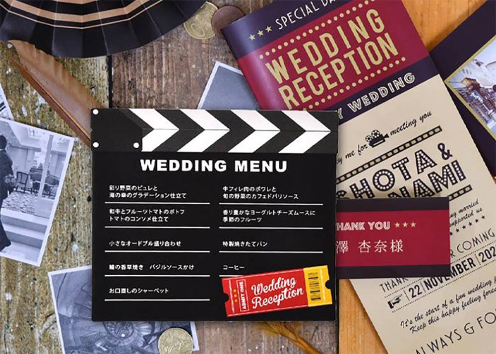 結婚式がはじまるまでのワクワク感を引き立てる!カチンコ型メニュー表