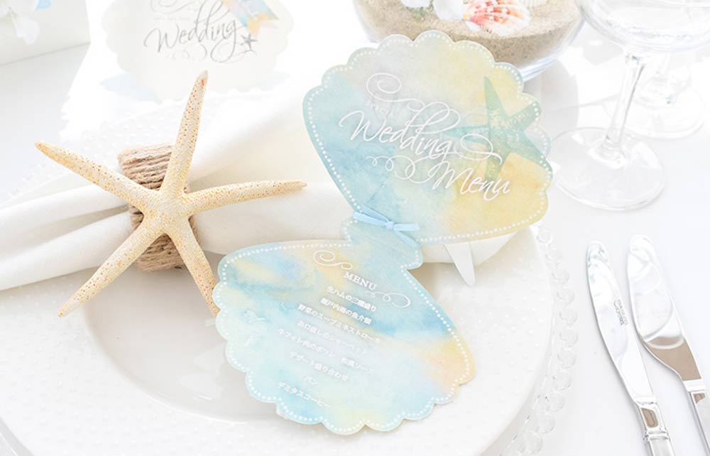 ビーチウェディングにぴったりの爽やかカラー!シェル型メニュー表