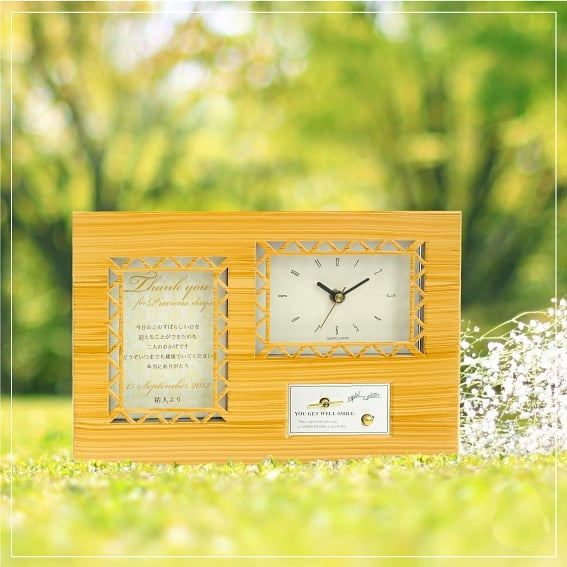 こちらは、ねじをまいてスイッチをいれると流れる曲は、結婚式にぴったりなsuperflyの「愛をこめて花束を」のワンフレーズ(約15秒分・リピート)が流れます。自分用にも用意したくなる、おしゃれなフォトフレームつき!