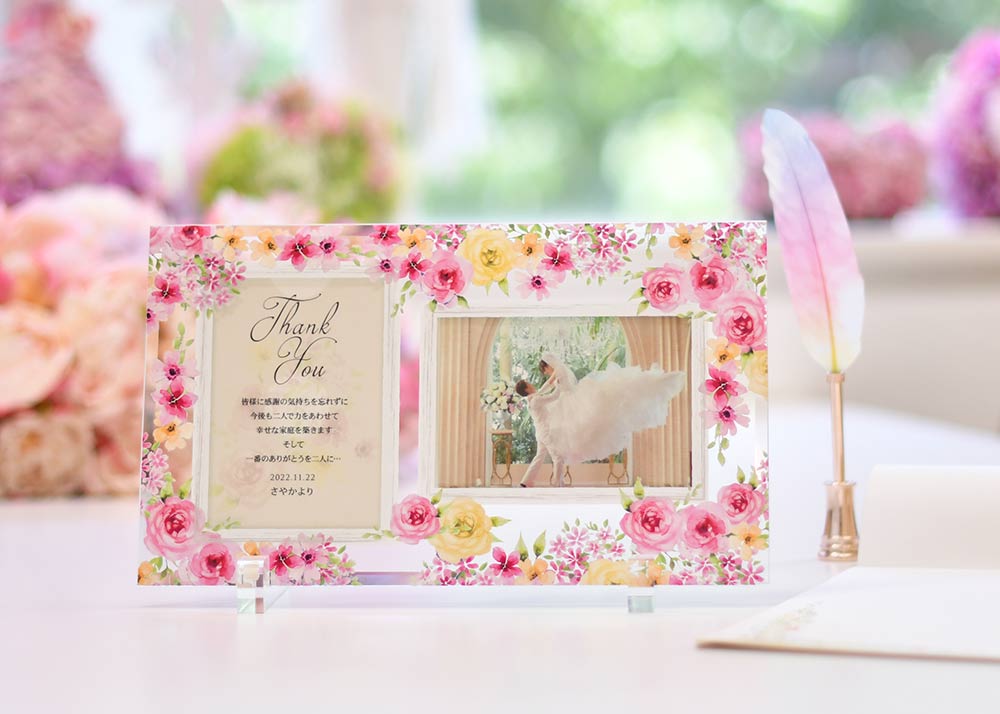 花束だけ準備していた人は、サプライズで結婚式の後日に両親の自宅にプレゼントを郵送してもいいですね。おすすめは、フォトフレーム付きのアイテム。結婚式の写真を飾って贈れば、両親へのうれしいサプライズギフトになりそうです。