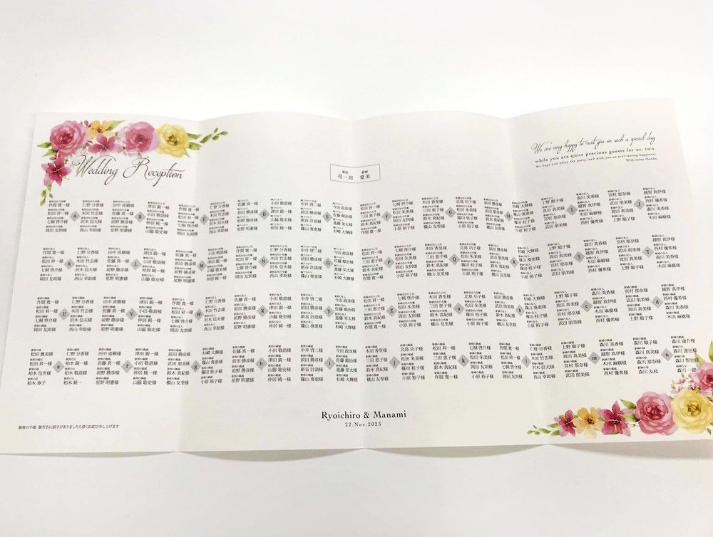 ウェディングショップファルベなら大人数席次表の対応もしてもらえる。(シーティングチャートもある)