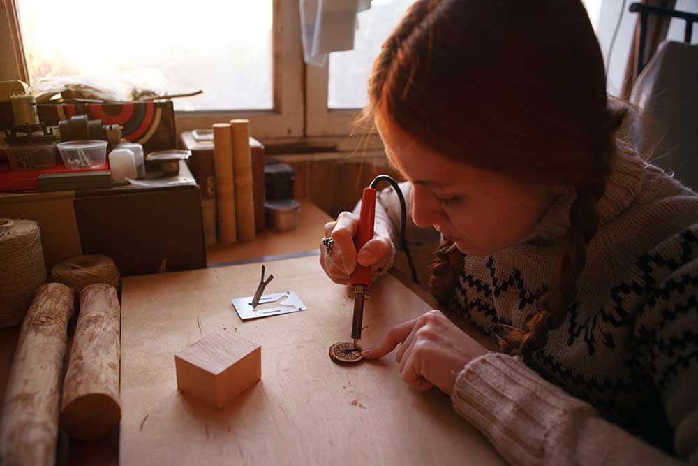 ウッドボードのような木材などの表面に、高温のコテのようなものをあて、その焼き色を使って絵や模様などを描くと、木材を熱で焦がした部分が柄になって残るんです。